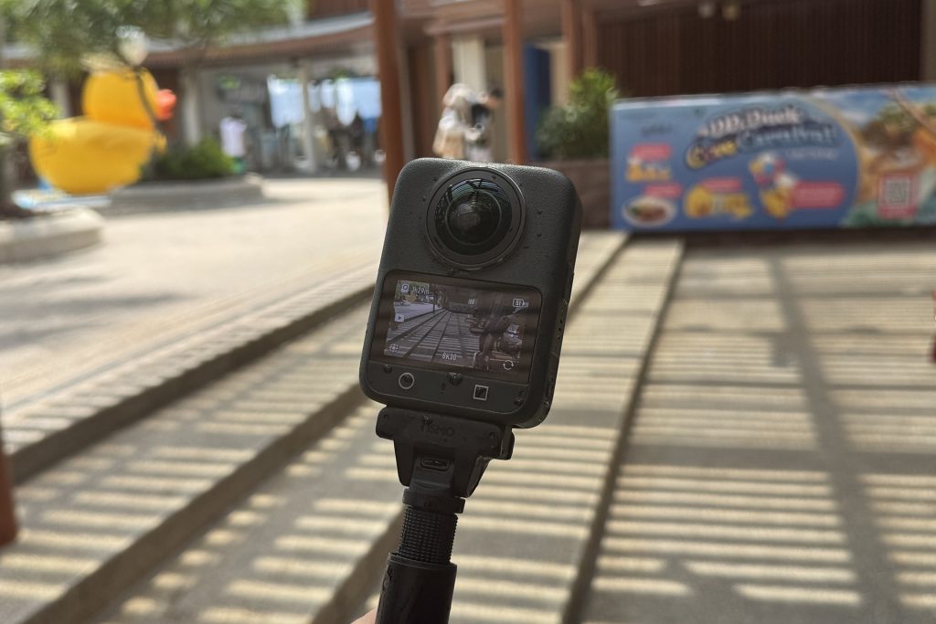 The built-in 2-inch touchscreen is bright enough for sunny Singapore afternoons, and the invisible selfie stick effect works without editor sweat, though it demands precise placement.