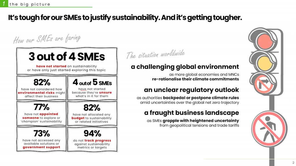 One striking statistic from the Barometer: more than 70% of SMEs have not tapped any form of government assistance or existing sustainability support, despite the slew of schemes on offer. That points not to a lack of effort from policymakers, but to persistent challenges in awareness, accessibility and perceived relevance.