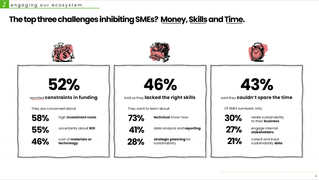 Time, unsurprisingly, is the third major pressure point. Over 40% of SMEs cited limited bandwidth and rising economic headwinds as key reasons they have not been able to explore the many programmes and schemes already available. Sustainability, for many, remains stuck in the “later, when things calm down” drawer.