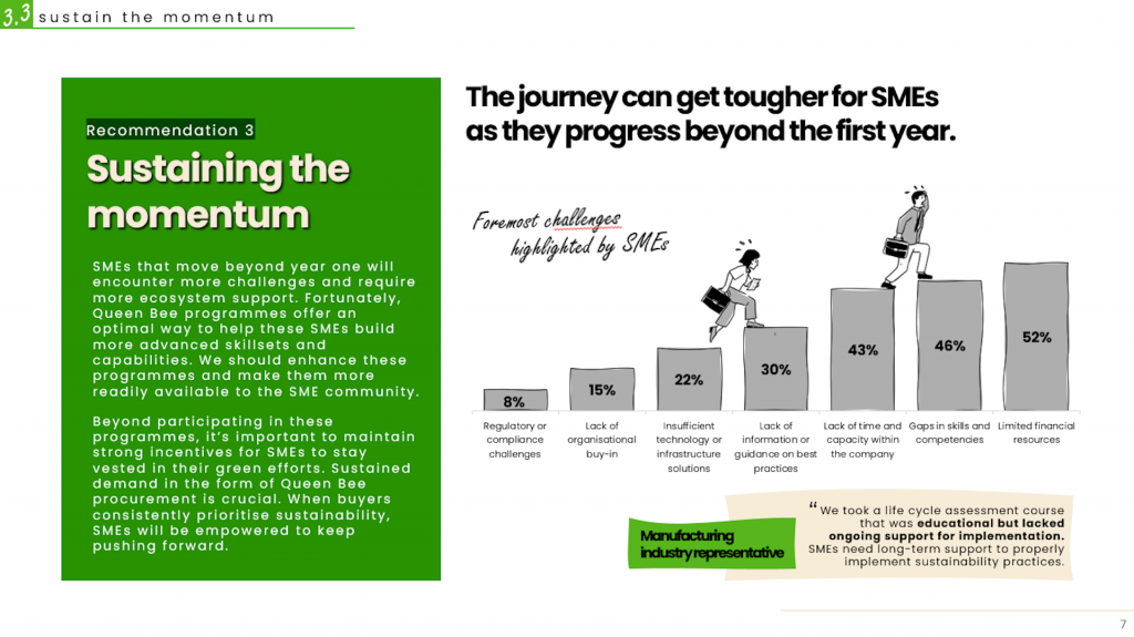 Fourth, cost remains a stubborn barrier. Nearly half of SMEs pointed to the high price of sustainable materials and solutions as a key obstacle. One way around this is to pool demand and solutions. For example, trade associations could help identify shared pain points and co-create sector-wide solutions with government partners, allowing SMEs to benefit from economies of scale rather than negotiating alone.